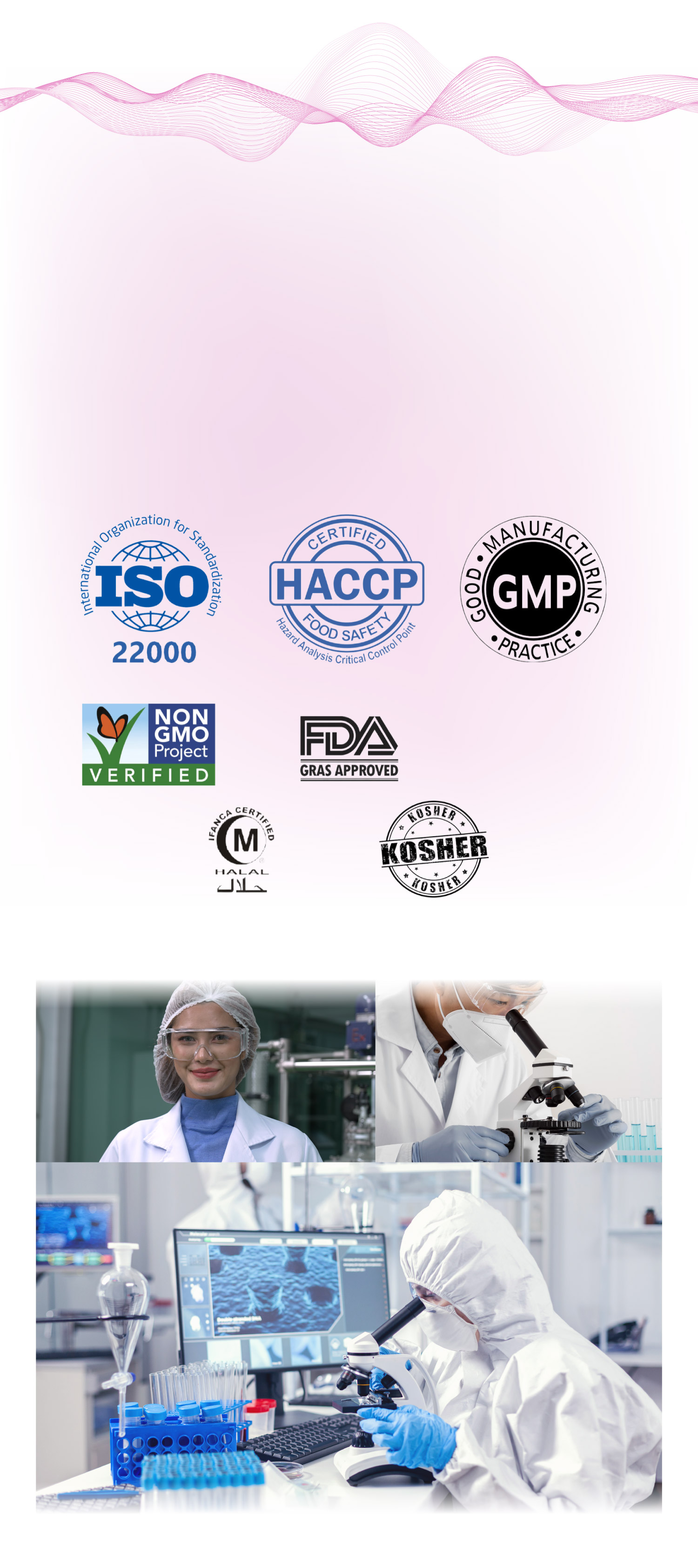 • 製造廠通過國際品質認證 ISO22000、HACCP、GMP,原料通過重金屬、塑化劑、48項動物用藥殘留等第三方檢驗,並獲得美國FDA食品安全GRAS、HALAL、KOSHER、Non-GMO等國際認證,安心有保障